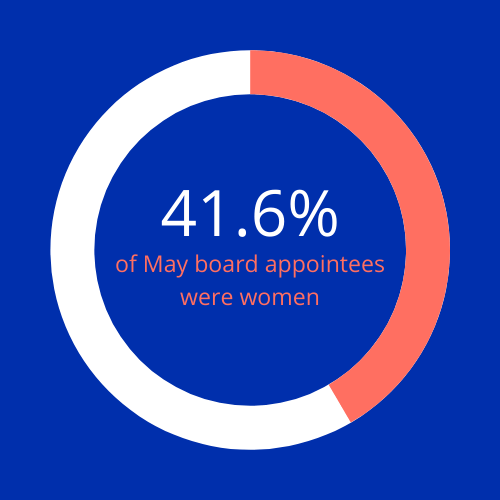 In May public companies appointed 149 women and 209 men to their boards. Women thus comprised 41.6% of all public board appointments – keeping in line with the past 7-month trend.